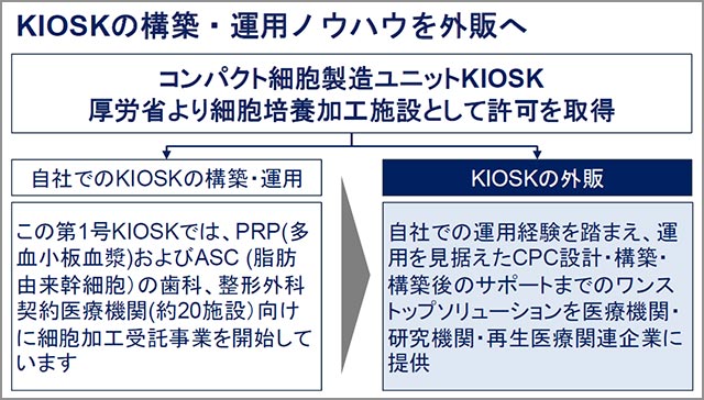 ◆自社でのKIOSKの構築・運用:この第1号KIOSKでは、PRP(多血小板血漿)および ASC(脂肪由来幹細胞)の歯科、整形外科契約医療機関(約20施設)向けに細胞加工受託事業を開始している