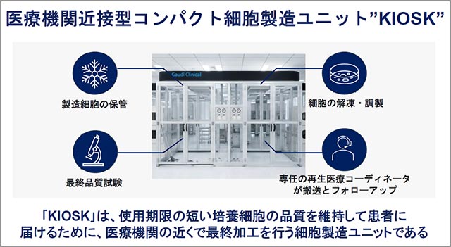 その最新トピックスは、Gaudi Clinical の医療機関近接型コンパクト細胞製造ユニット「KiOSK」(キオスク)を地方へ分散配置し、地域格差・医療格差なく再生医療を効率的にネットワークするプランだ。