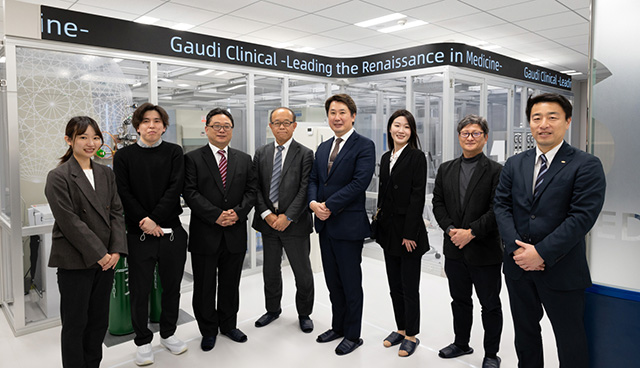 Gaudi Clinical 飛田護邦 代表取締役社長 CEO、同 柴田寛之 代表取締役副社長、同 林昌弘 執行役員・製造流通オペレーション本部長、同 森由紀夫 最高技術顧問、そして Gaudi Clinical 細胞培養加工施設 新日本橋 が入居する KISCO 福田晃之 取締役執行役員らが施設の特長は今後のビジョンについて教えてくれた。