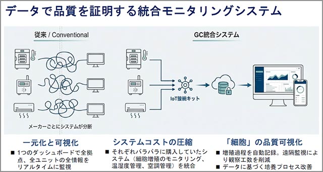 ◆システムコストの圧縮:それぞれバラバラに購入していたシステム(細胞増殖のモニタリング、温湿度管理、空調管理)を統合