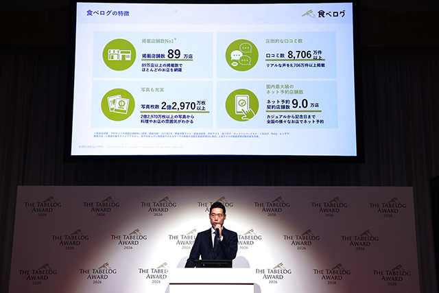 「食べログアワードの最大の特長をひとことでいうと、『権威より民意』。特定の専門家だけではなく、食を楽しむすべての皆様と決めるレストランアワードとして、世界に誇る日本の「美味しい」を日本中のあらゆる皆様といっしょに見つけ、称え、発信し続けていきたい」(カカクコム 鴻池拓 上級執行役員)