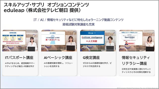 全契約ユーザーが見放題で視聴可能なコンテンツは、Hajimari「HR University」。オプションコンテンツは、テレビ朝日「eduleap」を利用可能。今後も引き続き学習コンテンツは拡大予定。