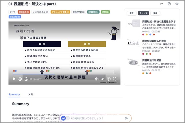 さらに分割されたシーンやタグを活用することで、一度学習した内容の振り返りが簡単にでき、知識の定着が可能に。