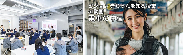 2025年10月、東京都内のかえつ有明中学校で実施された特別版出前授業では、赤ちゃんの特徴や育児について講義を通じて学び、妊婦ジャケット着用や赤ちゃん人形の抱っこ体験に加え、ママ・パパへの調査データを基に生成された「AI動画」を活用し、電車内で泣き止まない赤ちゃんや、エレベーターにベビーカーで乗れない焦りなど、ママ・パパが外出時に感じるリアルな“ドキドキ”を臨場感ある映像で見ることで、「自分ならどう感じるか」「その状況で何ができるか」を主体的に考えるきっかけを生徒に提供した。