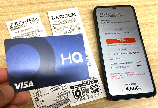 専用 HQカード で決済後、レシートの写真をスマートフォンでアップロードするだけ。