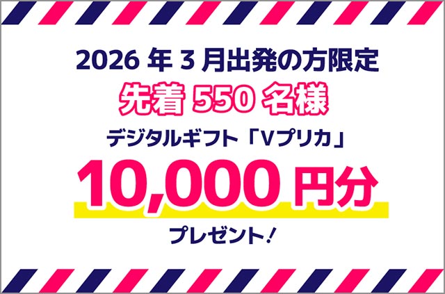 2月3日以降、留学ジャーナルで留学プログラムに申込んだ人で、3月31日までに出発する人に、先着550名に、デジタルギフト 「Vプリカ」10,000円分をプレゼント。