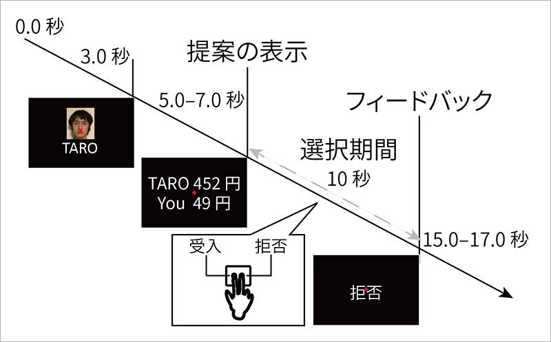 この課題では、各試行で別々の提案者からお金の分け方が提示され、参加者はその提案を受け入れるか、拒否するかを10秒以内に選択。