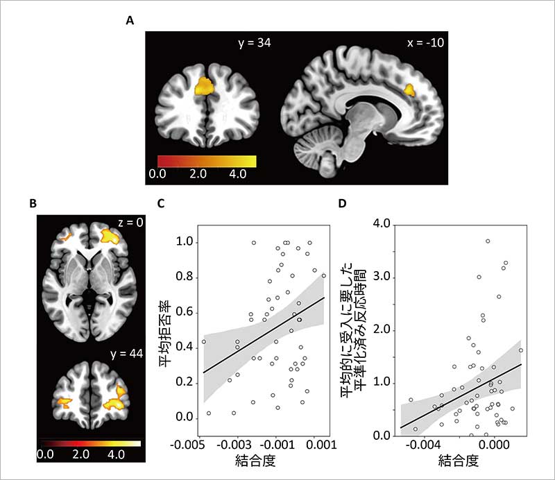 具体的には、背側前帯状皮質と腹外側前頭前野の脳活動の同期の強さ(結合度)は人によって異なり、この結合度がマイナスの大きな値をとるほど不公平な提案を受け入れる割合が高まり、そのときの反応時間が短くなることがわかった。