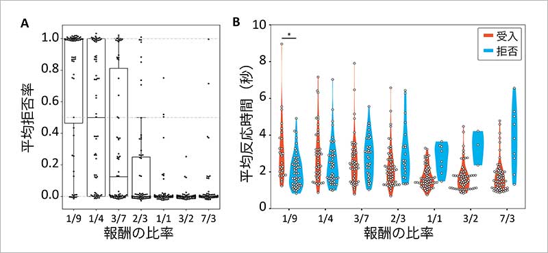 さらに、極めて不利な提案では、提案を受け入れる人の反応時間が、拒否する人の反応時間よりも長くなることが明らかに。
