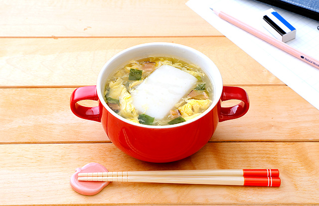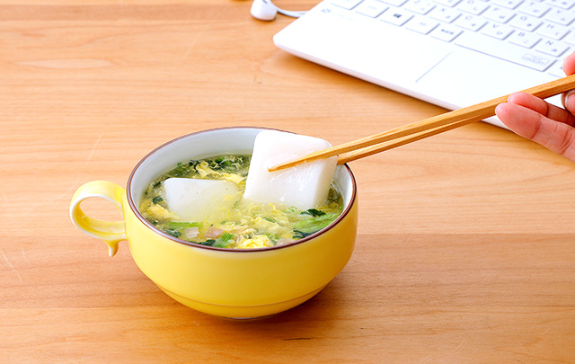 温かいスープとお餅の組み合わせは腹持ちが良く 、消化吸収の良いデンプン(炭水化物) により、必要なエネルギーをしっかりチャージできる。