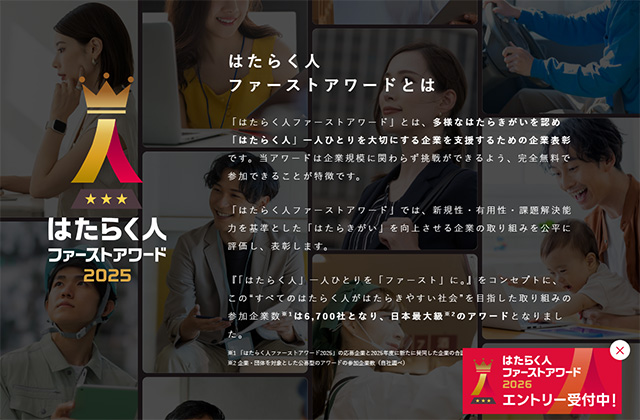 すべての企業において、より「はたらく⼈ファースト」なはたらき⽅を推進することを⽬的に、「はたらく⼈ファーストアワード 2026」参加企業の募集もスタート。