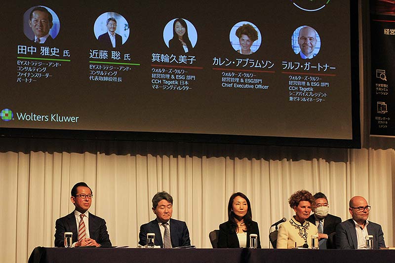 会場には、ウォルターズ・クルワー 経営管理 & ESG 部門 Karen Abramson(カレン・アブラムソン)CEO、同 CCH Tagetik 箕輪久美子 日本マネージングディレクターらが登壇し、新たに動き出すソリューションについて説明。