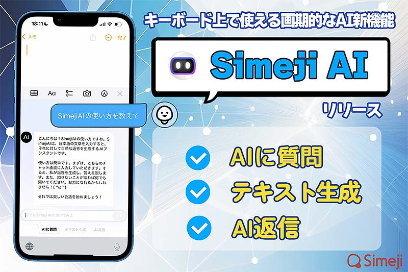 Simeji AI は、聞きたい内容を入力するだけで AI が適切な回答を導き出してくれる。おもに「AIに質問」「テキスト生成」「AI返信」の3機能が設定されている。