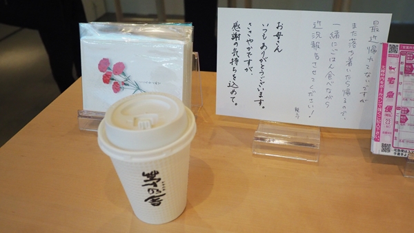 もちろん、母の日限定パッケージ「カーネーション柄」商品も並ぶ。カーネーションが施されたポストカードと手紙を書けるスペースも店内に用意されており、購入から配送までその場でできる。