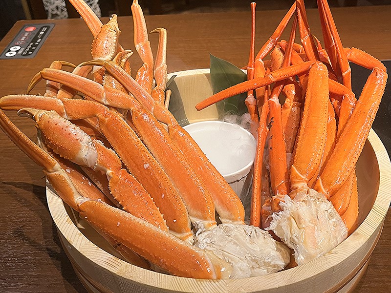 足の数を数えるのもばからしくなる量の蟹が木桶に乗ってやってきた。聞けば2人前らしく、1人で取材に来たのは間違いだったと確信した。いや、仮に2人で来たとしても、この量の蟹は果たして食べ切れるのだろうか……。