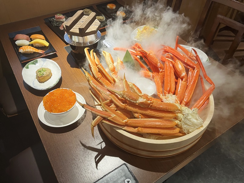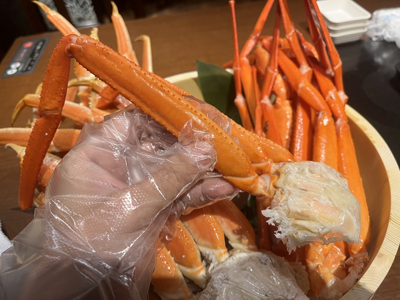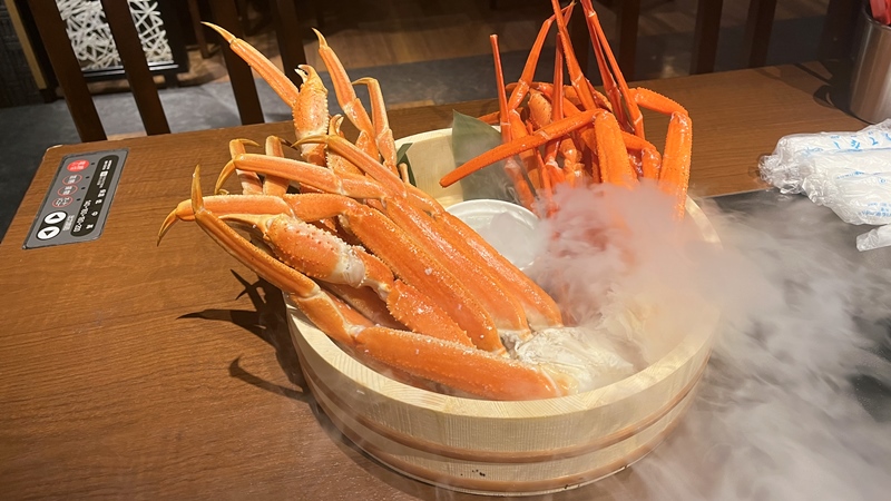 懸念は当たった。取材中は蟹を食べる以外ほとんど何もできなかった。最初はカニフォークを使って丁寧に身をかき出していたが、その速度では「間に合わない」ことにすぐ気が付く。外面など構っていられない。足を引きちぎり、素手で割って身にかぶりつく、それを何度繰り返しても目の前の蟹が尽きることはない。サイドメニューに「かにクリームコロッケ」や「かに釜めし」、寿司やいくら丼もある。美味そうだ。しかしこれらを頼む余裕はない。