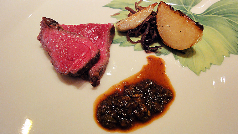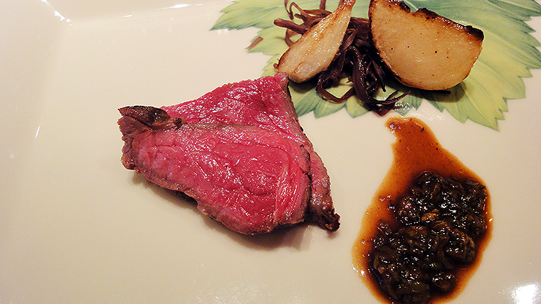 「甲州牛よりも脂肪が少なく赤身が非常においしい。それを今回はシンプルに低温ローストにしました。ワインのスパイシーな香りに合うように、いま旬をむかえた山梨のふきのとうと味噌でふき味噌にし、そこにワインやフォンドボー、バルサミコ酢を加えたソースを合わせています」