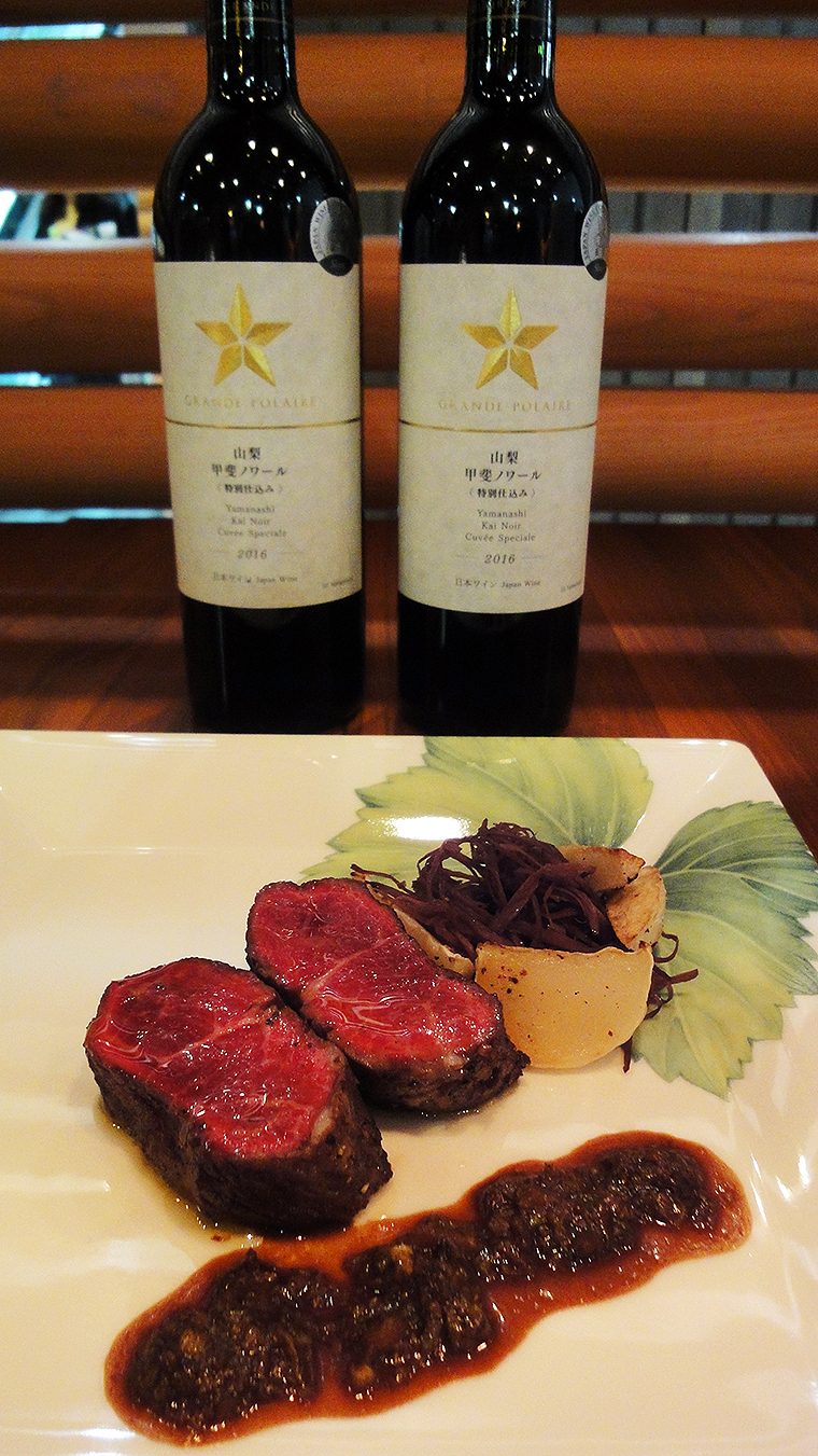 田崎真也は、このグランポレール プレミアムシリーズ「山梨甲斐ノワール<特別仕込み>2016」と「甲州ワインビーフのロースト~ふき味噌風味ソース~」のマッチングについて、こう説明する。