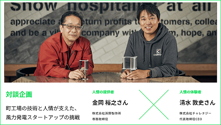 「町工場の技術と人情が支えた、風力発電スタートアップの挑戦」と題した対談企画では、人情の提供者 金岡裕之さん(浜野製作所 専務取締役)と、人情の体験者 清水敦史さん(チャレナジー代表取締役CEO)の対談を掲載。