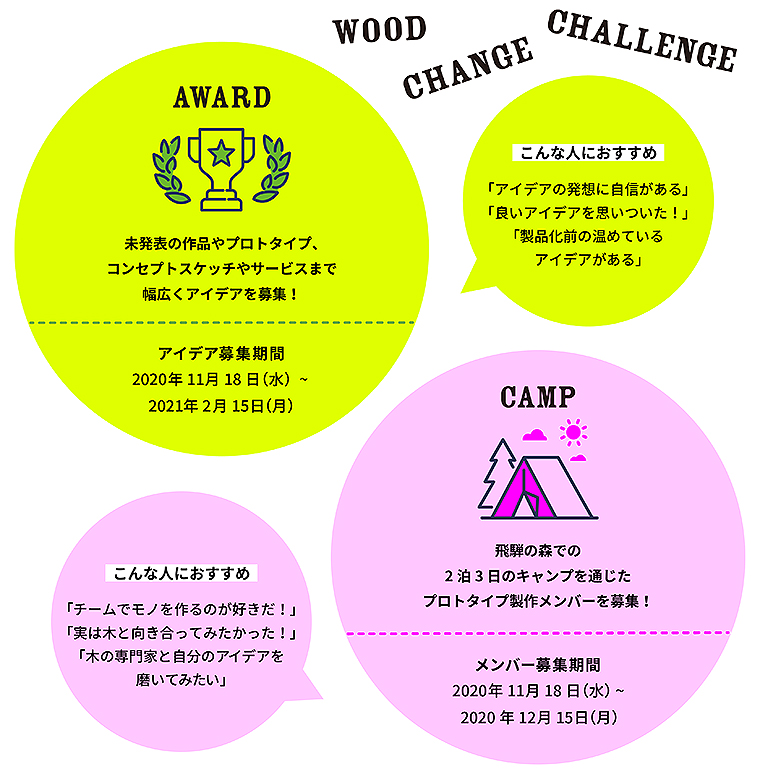 WOOD CHANGE CAMP(https://awrd.com/award/woodchangecamp)は、国産材と森の利用を大胆にチェンジするチームを結成し、飛騨の森での2泊3日キャンプを機にプロトタイプを製作。新たなものづくりのデザインに挑むクリエイターを募集している。