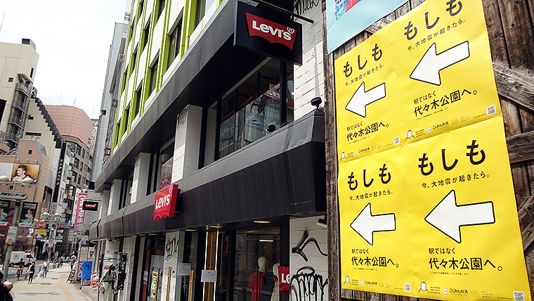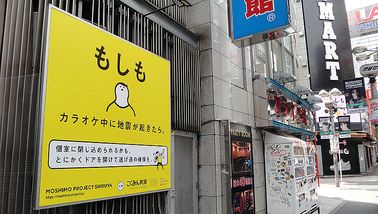 いま渋谷センター街などを歩いていると、黄色地のビジュアルがいたるところにみかける。そこには、「もしも、飲み会中に地震が起きたら」「もしも、カラオケ中に地震が起きたら」「もしも、いま、大地震が起きたら」といった問いかけが……。