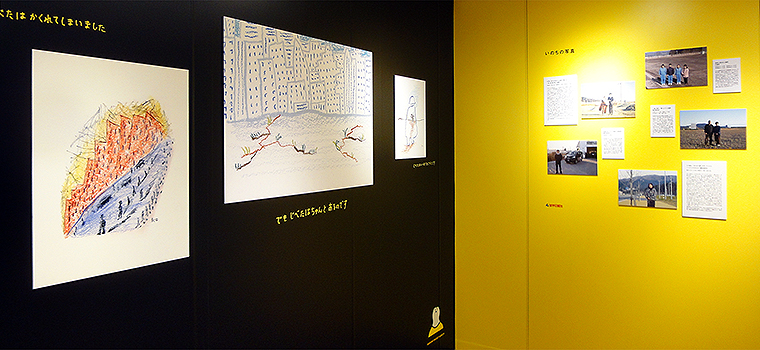 さらに2階には、震災・災害・減災にむけた絵本や、谷川俊太郎・黒田征太郎による絵本「じべた」、岩手日報社による東北大震災の写真記事などが紹介されている。