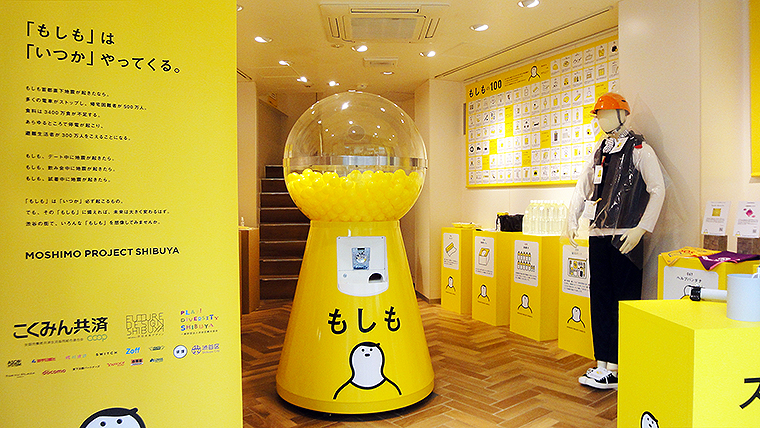 こうしたビジュアル・デジタルサイネージ展開のほかに、首都直下型地震を想定した「備え」を紹介するリアル展示会「もしも展」も渋谷警察署宇田川交番前スペースに出現した。