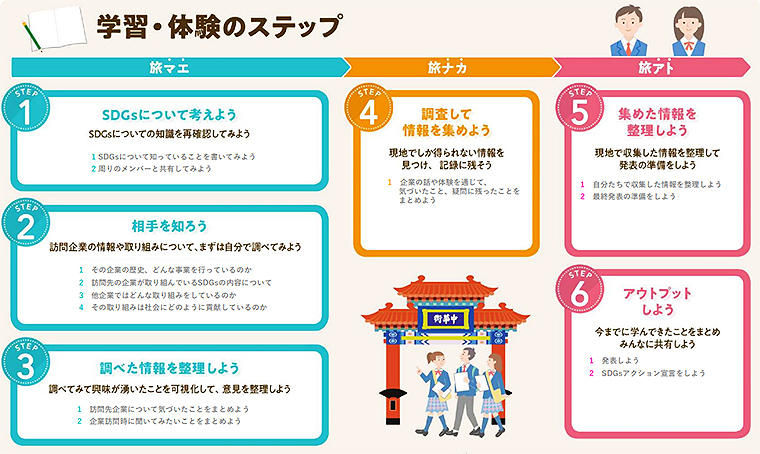 旅マエでは(1)SDGsについて考えよう(2)訪問企業を知ろう(3)調べた情報を整理しよう というステップが。