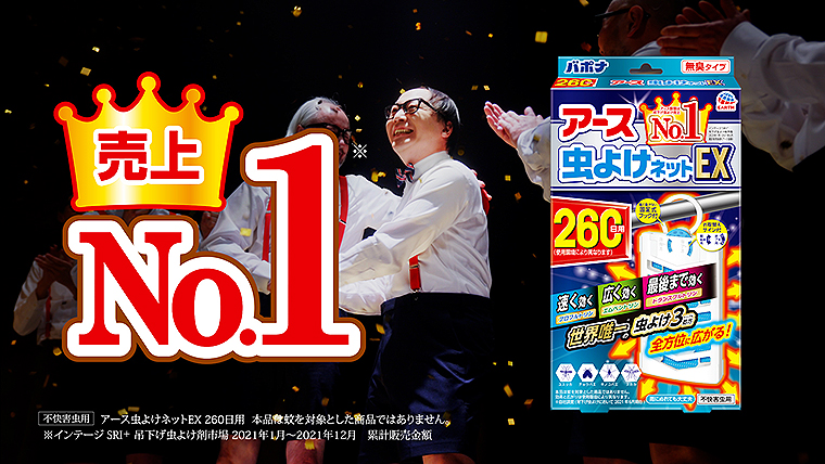 最後には、スポットライトを浴びてよろこぶようすで、「みんなちがってみんないい」といいつつも、「売上No.1のアース虫よけネットEXを選んでほしい」という本音を切実に伝えている。