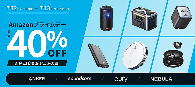 Anker(アンカー)ジャパンも7月12・13日48時間だけのAmazonプライムデーで、最新のポータブル電源を含むチャージング関連製品やオーディオ製品、家電製品等、最大40%OFFにて販売。